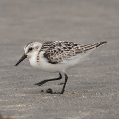 4月から5月の春と7月から10月にかけて旅鳥として見られるシギです。他のシギに比べ小型で、嘴や脚が短いのが特徴です。潮が引いたあとの護岸や干潟でヨコエビなどの底生生物を採食している様子が見られます。
