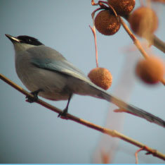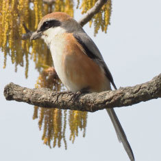 全長20 cmの肉食性の鳥です。先端が下に曲がった嘴を持ち、昆虫やトカゲ、小鳥などを捕食します。とらえた獲物を木の枝にさす「はやにえ」をすることで有名です。公園などの周囲を見渡せるような場所に止まっている姿をよく見かけます。