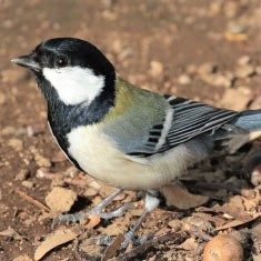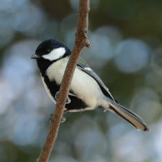 住宅地でもよく見かける留鳥です。胸から腹面に続くネクタイのような黒い線が特徴です。雌雄でこの模様の太さが違い、オスのほうが太く、メスは細い模様です。木の枝や幹の隙間、パイプの中など様々な場所に巣を作り、巣箱もよく利用します。