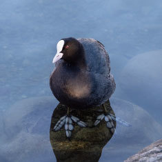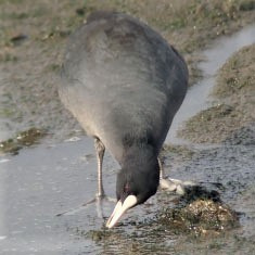 10月から4月にかけて三番瀬でよく見られる鳥です。体全体が黒色で、白い嘴が特徴的です。カモ類よりもやや小型ですが、クイナの仲間では大型種です。雑食ですが、三番瀬では主に護岸や岩に生えた藻類を食べます。