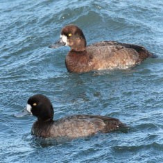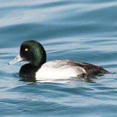 10月から3月にかけて三番瀬に飛来するカモの仲間です。キンクロハジロに似ていますが、本種は頭部に飾り羽がありません。海底のアサリなどの貝類を食べ、時折潜水している様子が見られます。