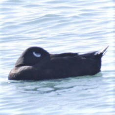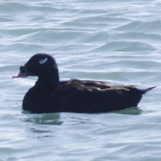 11月から3月にかけて冬鳥として渡来します。全身が黒く、オスの嘴の根本にコブがあり、さらに眼の下白い線があるのが特徴です。潜水が得意で貝類や甲殻類を主に食べます。スズガモの群れに混ざっていることが多いです。