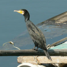 全長約 80㎝の大型の水鳥で留鳥。体は全体的に黒く、エメラルドグリーンの眼が特徴。数千羽の群れで飛来し、得意の潜水で主に魚を捕って食べます。潜水後、羽を広げて干している姿もよく見られます。鵜飼でよく使われるウミウとは別種です。