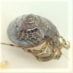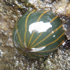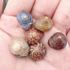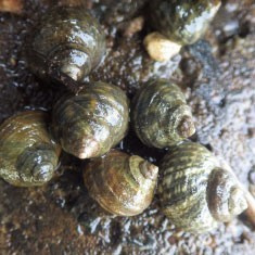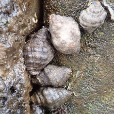 ずんぐりむっくりした小さな巻貝です。海岸の岩場に生息している貝で、三番瀬では護岸の波打ち際の少し上くらいに位置に集団でいます。海と絶妙な距離感を持って生活していて、水嫌いの貝として知られています。タマキビを海水に入れると這い上がってくる様子が観察できます。