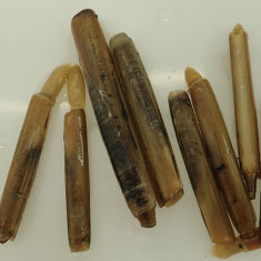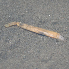 細長い二枚貝で、穴に塩を入れる変わった採集が人気を集めています。干潟の二枚貝の中では砂に潜らせたらとにかく早いです!薄く細長い貝殻は素早く潜るために進化したのかもしれません。また水管に秘密があって刺激を受けると、まるで切り取り線があるかのようにキレイに切れます。手軽に食べられるエサだと思われているのか、こればかり食べる魚もいるほどです。