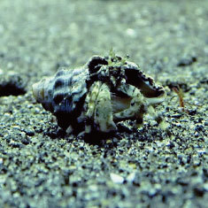 干潟のヤドカリといったら本種!どこの干潟でも見られ、大きな石やカキ殻の周りにたくさんの個体が群れています。ムチのような細長い触角と右手のハサミが大きくなることが特徴です。冬から春先には交尾前ガードと呼ばれるオスがメスの入った貝殻を持ち歩く繁殖行動が見られ、メスをめぐるオス同士のバトルが観察できます。