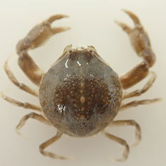 丸くて硬い甲羅につぶらな眼が特徴のカニです。干潟の他のカニと比べると前歩きが得意で、よく“前に倣え”のポーズのように腕を伸ばして前進しています。干潟では潮だまりや澪筋など水中にいることが多いです。食べ物のにおいには敏感で、においがする方に急に走り出します。よく見かけるカニですが、子供がどこにいるのか未だ分かっていません。