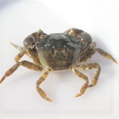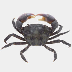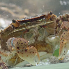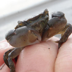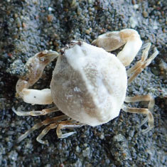 海辺の岩場でよく見かけるカニです。迷彩柄のような独特なまだら模様があるので、他のカニと見分けるのが簡単です。またオスにだけハサミの付け根にぷにぷにとした袋が付いています。挟む力が強いので触る時は注意が必要です。三番瀬では護岸下の岩場やテトラポットのすき間によく隠れています。