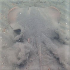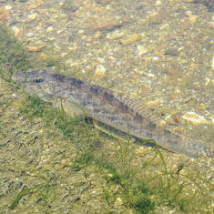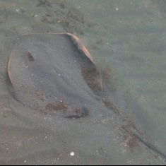 三番瀬でよく見かけるエイの仲間で、大きくなると1m以上にもなります。境川など波静かな場所で泳ぐ姿や浅場でじっとしている姿を観察することができます。砂の中の生物を食べる肉食の魚で、干潟にクレーターのようなくぼみがあれば、アカエイが砂を掘った跡かもしれません。