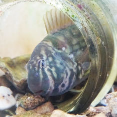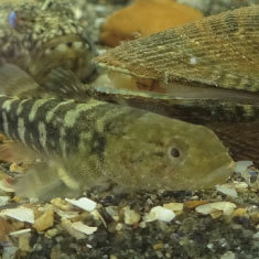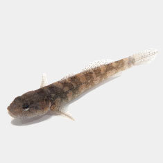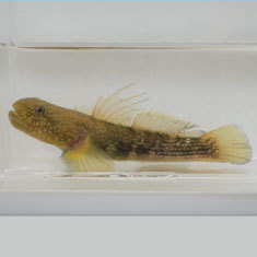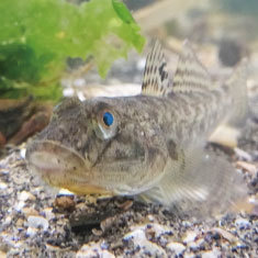 転石や護岸のタイドプールのすき間を網でガサガサすると採れるハゼの仲間です。体色は褐色~黒色で、ほっぺに白く小さな斑点がちりばめられているのが特徴です。ある日、水槽で観察していると、口よりも大きいカニをつかまえて頬張っていました。他にも小魚や藻類など様々なものを食べる雑食性の魚です。