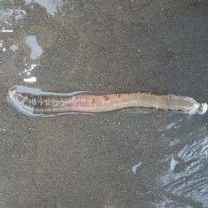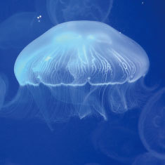 クラゲと言ったら本種を思い浮かべるのではないでしょうか?東京湾は日本の中でも特に個体数が多いことで有名で、港などをのぞき込むと大量のミズクラゲがふわふわ泳いでいる姿が観察できます。干潟では弱って打ち上げられている個体がいますが、肌が弱い子は要注意。他のクラゲに比べると弱いですが、ちゃんと毒を持っています。