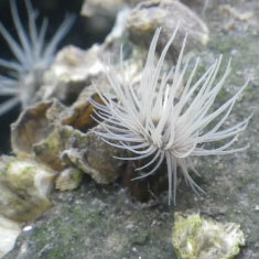 潮が引いた後に石や護岸を見るとたくさんのぷるぷるゼリーがくっついていることがあります。よく見るとオレンジ色の細い縦じまが走っていたら本種かもしれません。東京湾ではいたるところで観察でき、護岸だけでなく牡蠣殻などにもよくくっついています。再び潮が上がってくると花びらのような触手を広げて獲物を待ちます。