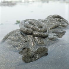干潟に砂で作ったモンブランケーキがあれば、本種のうんちかもしれません。このうんちはタマシキゴカイが干潟の砂を食べて、中の有機物を吸収した後に吐き出したもので、汚くありません。またうんちの近くにある茶色の水風船のようなものは卵の塊で数万個もの小さな卵が入っています。