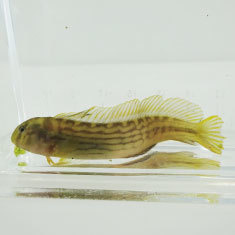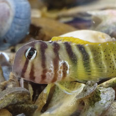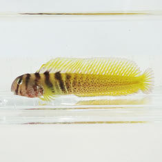 全長8cmほどのギンポの仲間です。鮮やかな黄色の虎模様が特徴です。繁殖期になると、雄は黒っぽい婚姻色へと変化し、求愛ダンスでメスへアピールする習性を持っています。岩礁、タイドプールなどで見られ、オオヘビガイやカキ殻などの狭いすき間を棲みかにします。漂着した空ビンなどに隠れていることもあります。
