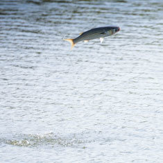 東京湾でよく見られる魚で、全長50㎝程。雑食性で、藻類やデトリタス(水底に積もった有機物の粒子)などを食べます。泥が混ざった有機物をうまく消化するための幽門という器官が発達しているのが特徴です。よく跳ねる魚で、三番瀬でも、バシャバシャ水面を揺らしているのはこの種です。