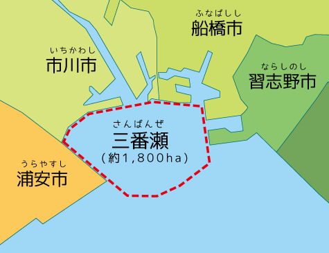 三番瀬は東京湾の一番奥にある干潟と浅海域で、浦安市、市川市、船橋市、習志野市に面しています。元は旧江戸川の河口にあった広大な干潟でしたが、現在は埋め立てなどにより、約1,800haの広さが残されています。